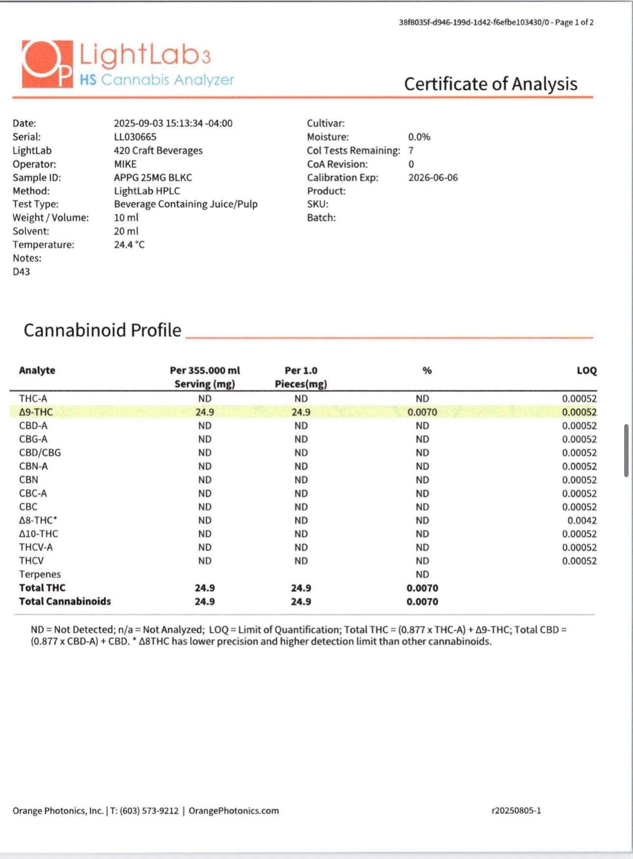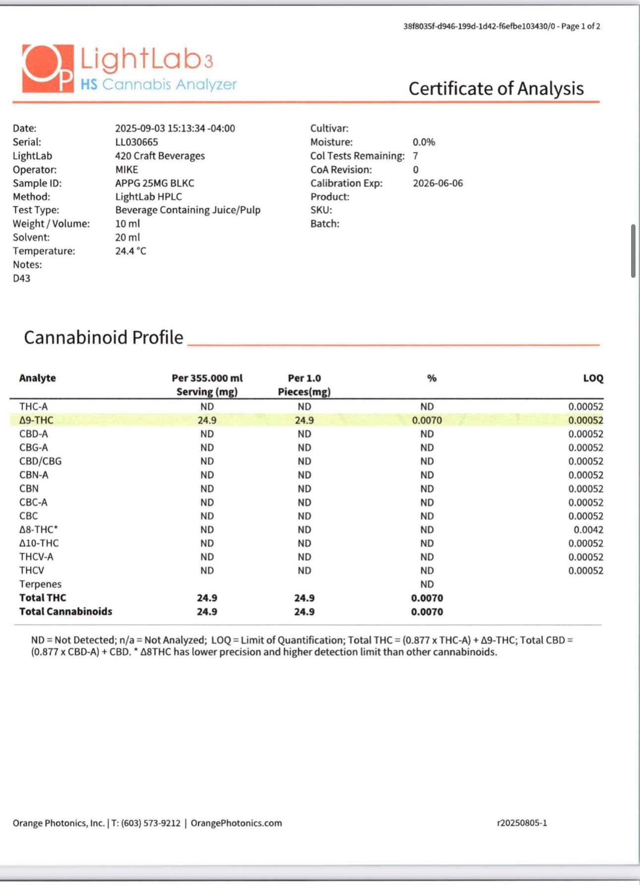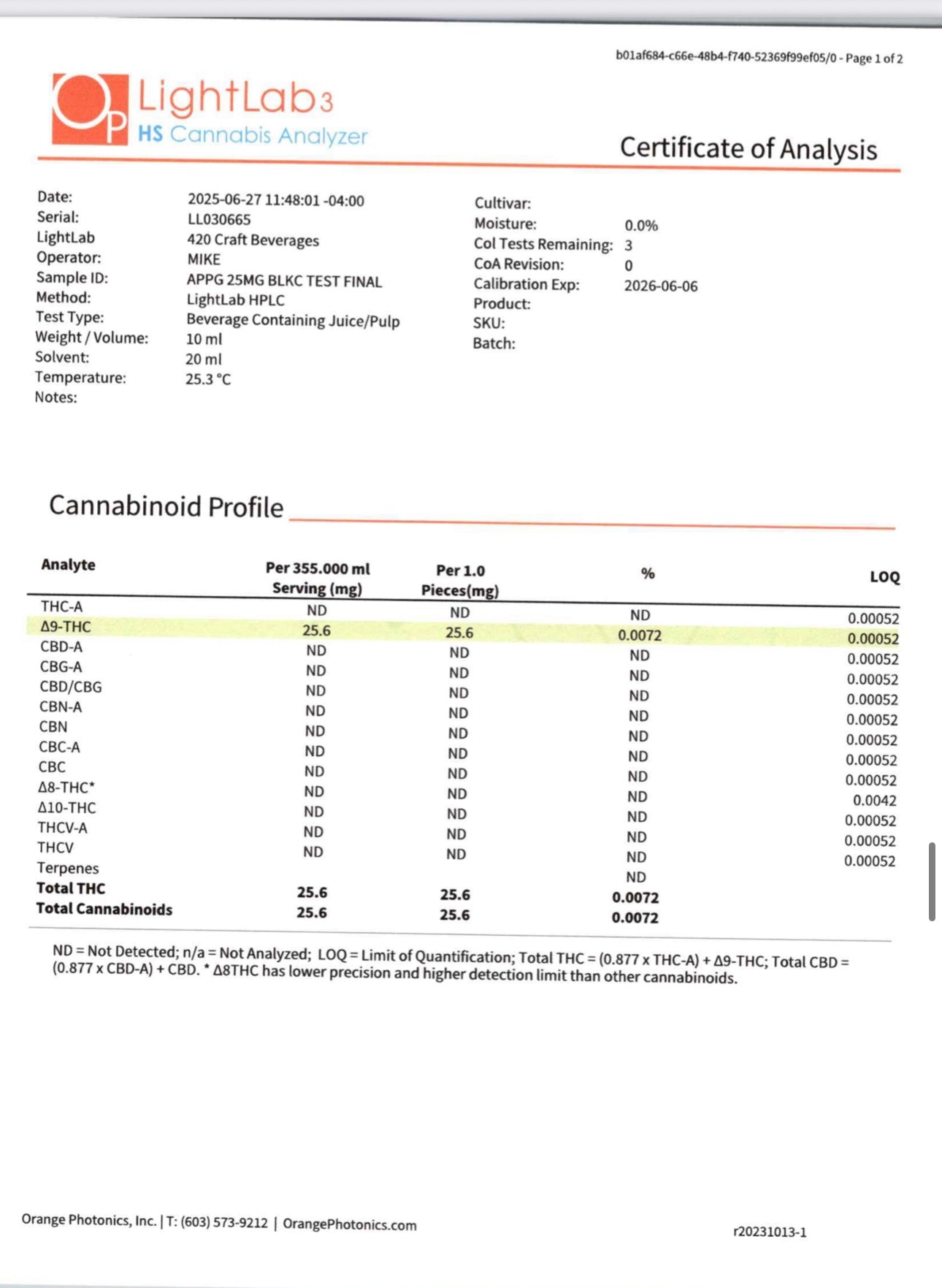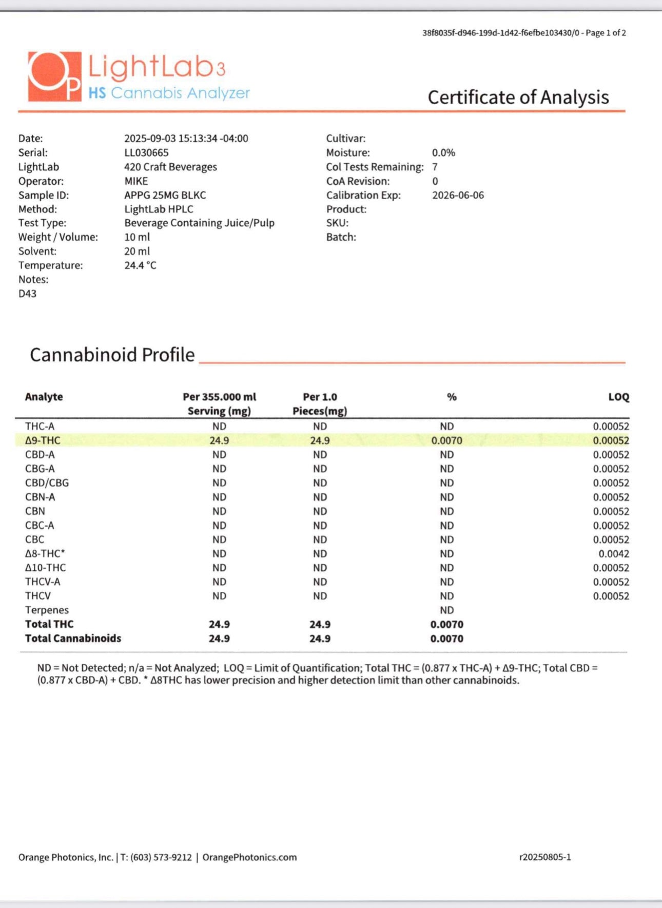 Cannabis can impair concentration, coordination, and judgment. Do not operate a vehicle or machinery under the influence of this product. Warning:This product has intoxicating effects and may be habit forming. Consumers should consult a licensed healthcare professional if pregnant, breast feeding, currently taking medications, or under the age of 21 before consumingcannabis beverage contained herein. Manufactured under License fromThe Ohio Department of Agriculture. 2018 FARM BILL COMPLIANT.