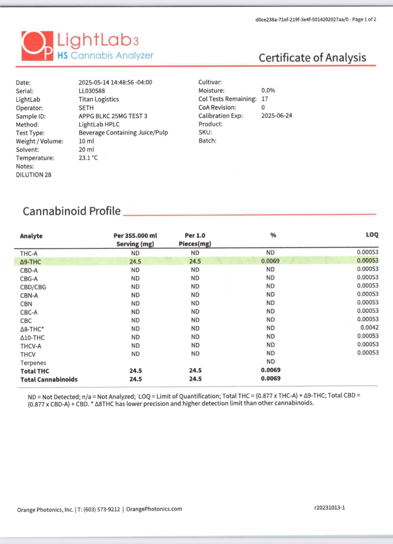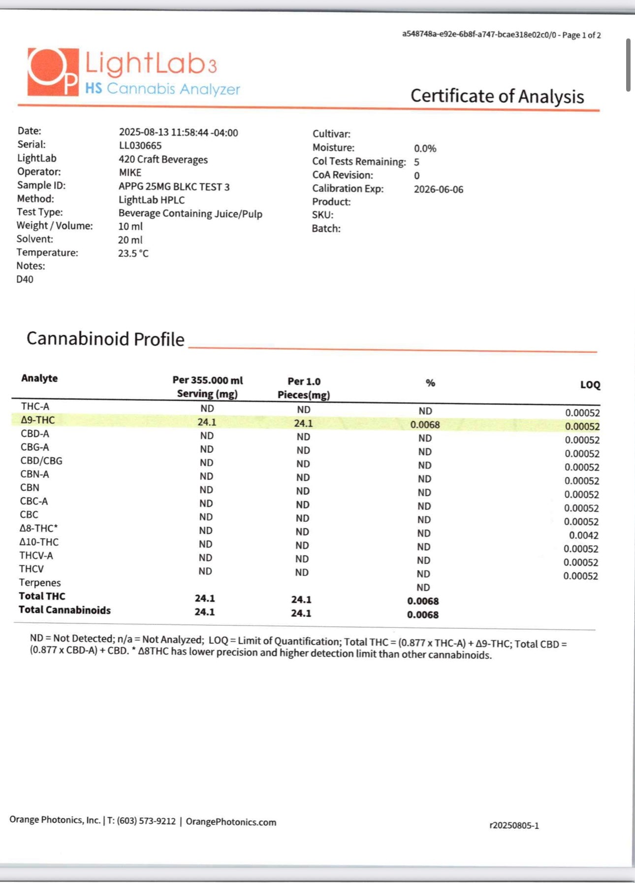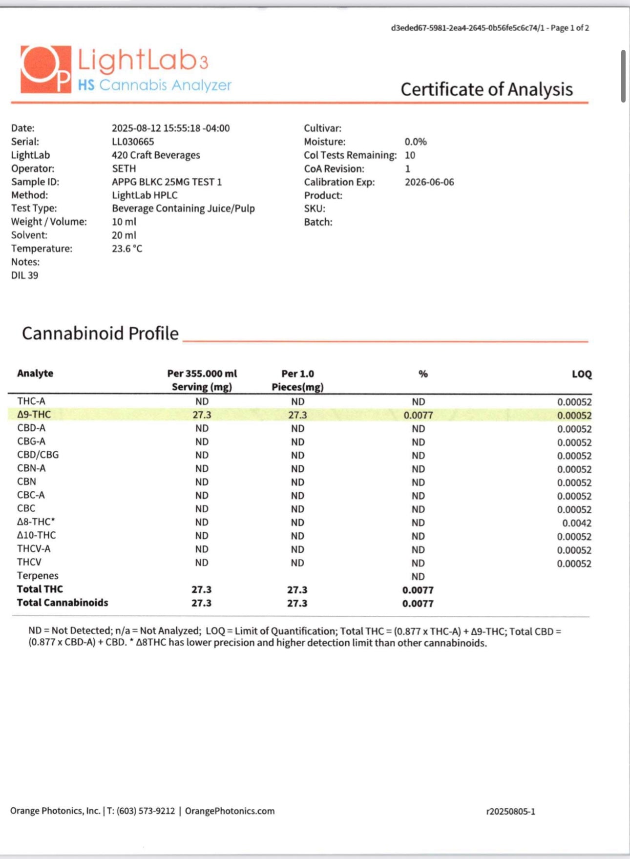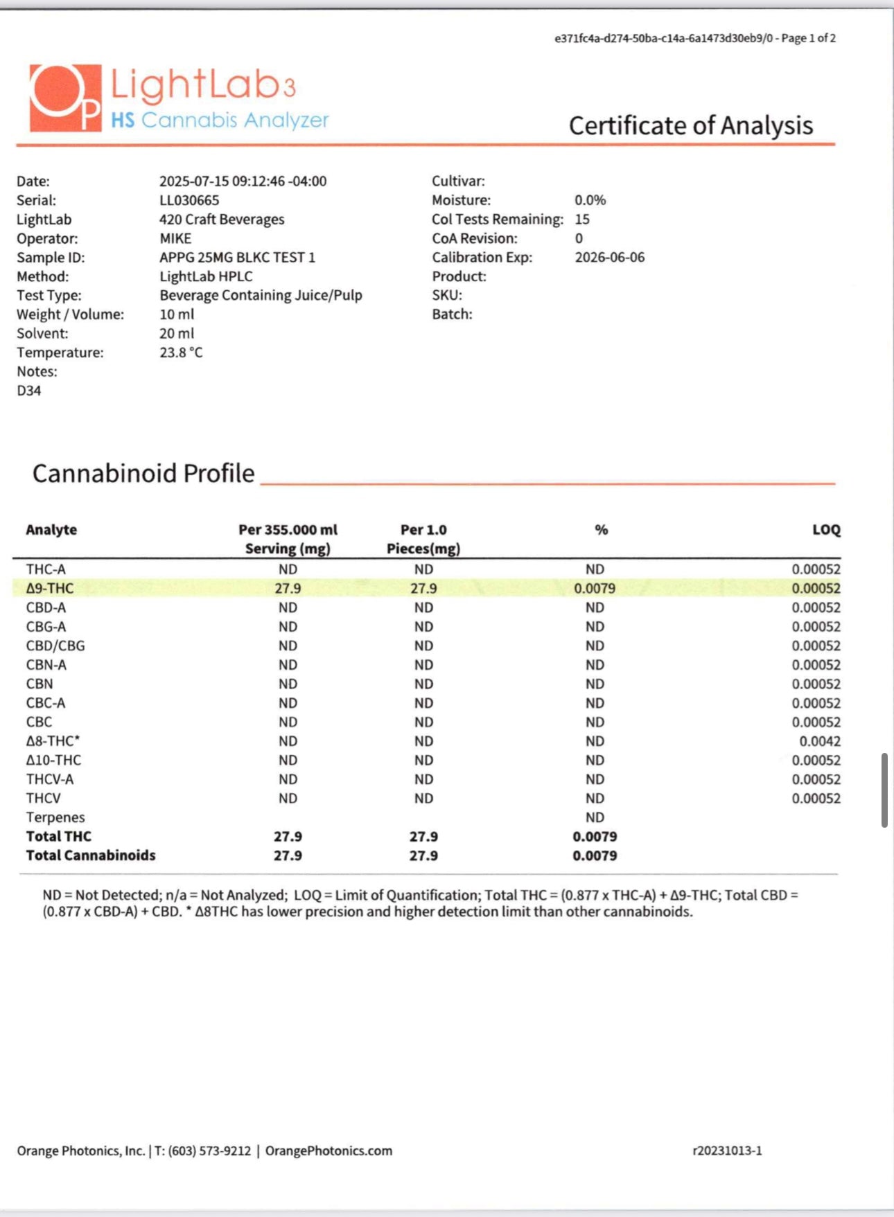 Cannabis can impair concentration, coordination, and judgment. Do not operate a vehicle or machinery under the influence of this product. Warning:This product has intoxicating effects and may be habit forming. Consumers should consult a licensed healthcare professional if pregnant, breast feeding, currently taking medications, or under the age of 21 before consumingcannabis beverage contained herein. Manufactured under License fromThe Ohio Department of Agriculture. 2018 FARM BILL COMPLIANT.