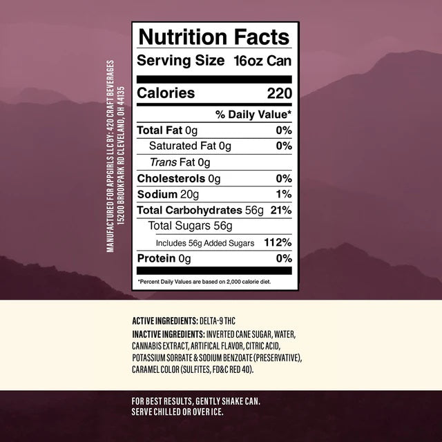Inverted Cane Sugar, Water, Cannabis Extract, Artificial Flavor, Citric Acid, Sodium Benzoate (preservative), Caramel Color (Sulfites, FD&C Red 40).