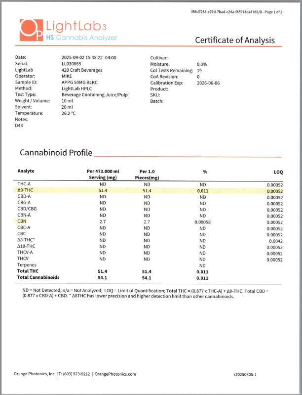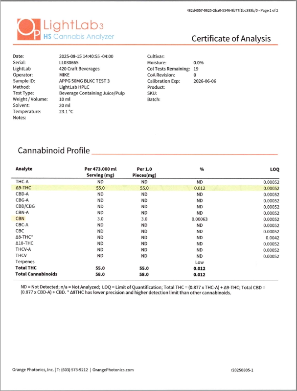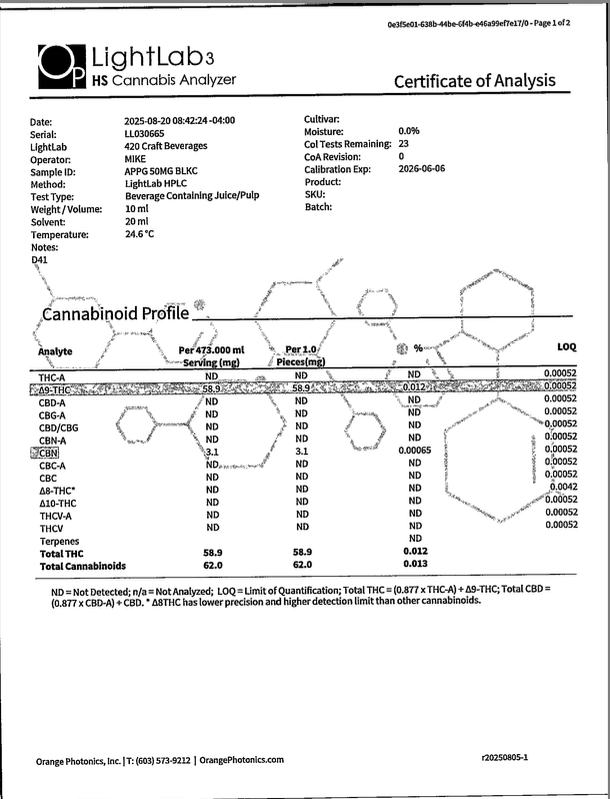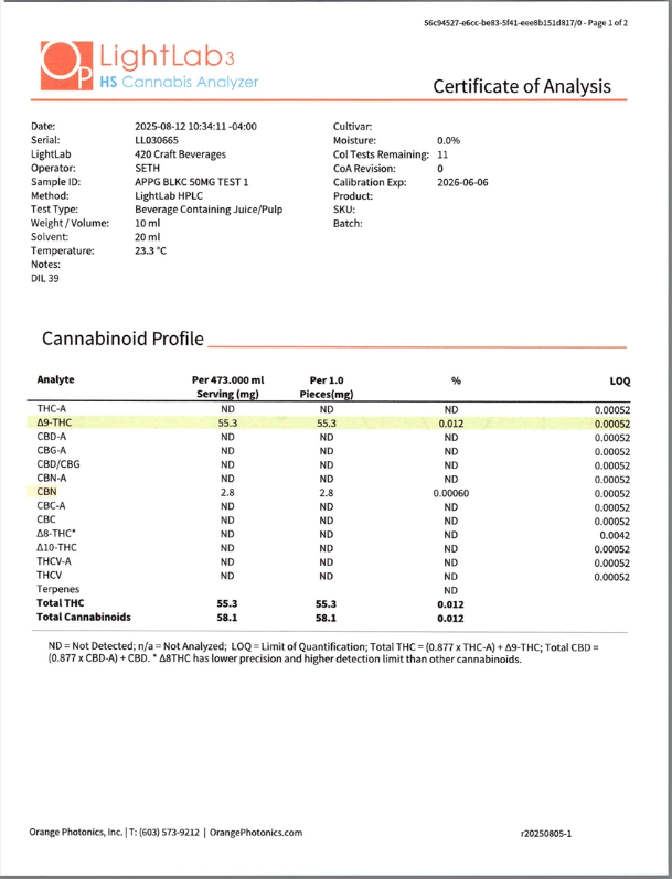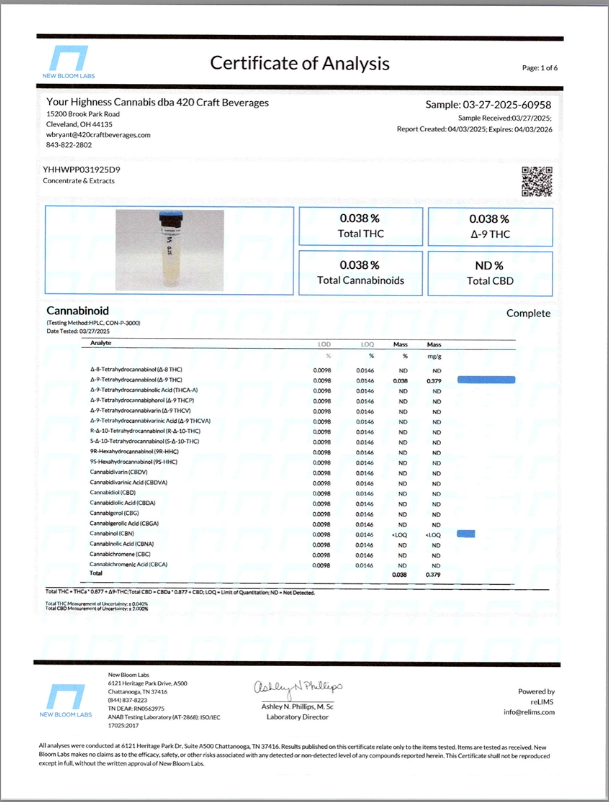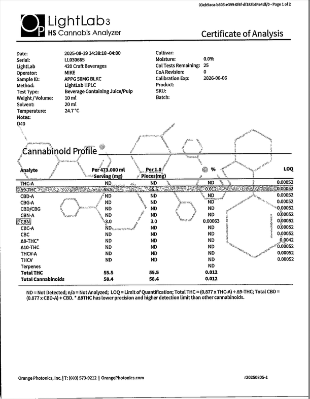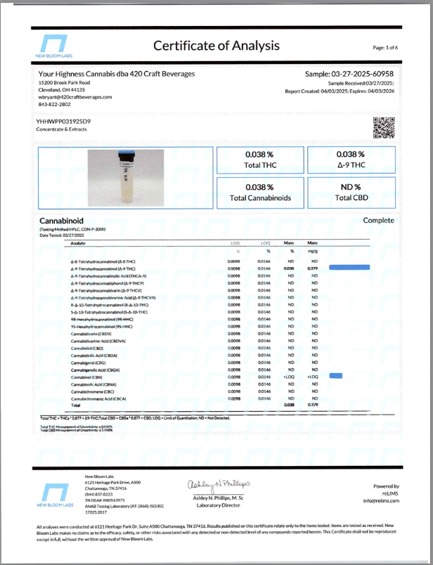Cannabis can impair concentration, coordination, and judgment. Do not operate a vehicle or machinery under the influence of this product. Warning:This product has intoxicating effects and may be habit forming. Consumers should consult a licensed healthcare professional if pregnant, breast feeding, currently taking medications, or under the age of 21 before consumingcannabis beverage contained herein. Manufactured under License fromThe Ohio Department of Agriculture. 2018 FARM BILL COMPLIANT.