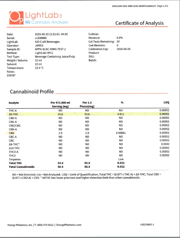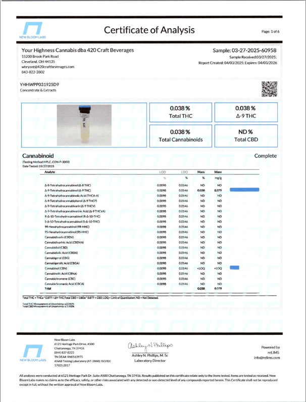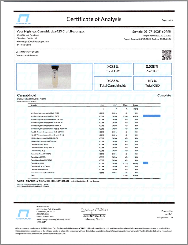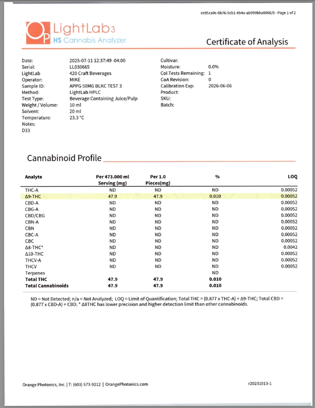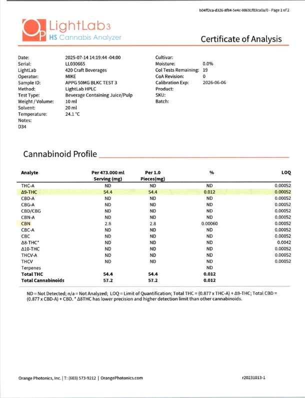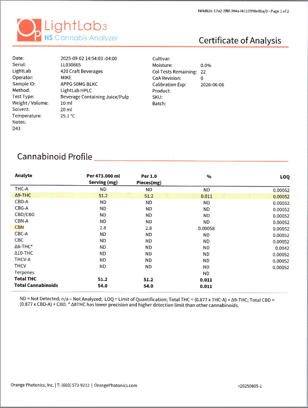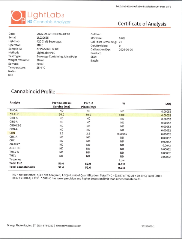 Cannabis can impair concentration, coordination, and judgment. Do not operate a vehicle or machinery under the influence of this product. Warning:This product has intoxicating effects and may be habit forming. Consumers should consult a licensed healthcare professional if pregnant, breast feeding, currently taking medications, or under the age of 21 before consumingcannabis beverage contained herein. Manufactured under License fromThe Ohio Department of Agriculture. 2018 FARM BILL COMPLIANT.