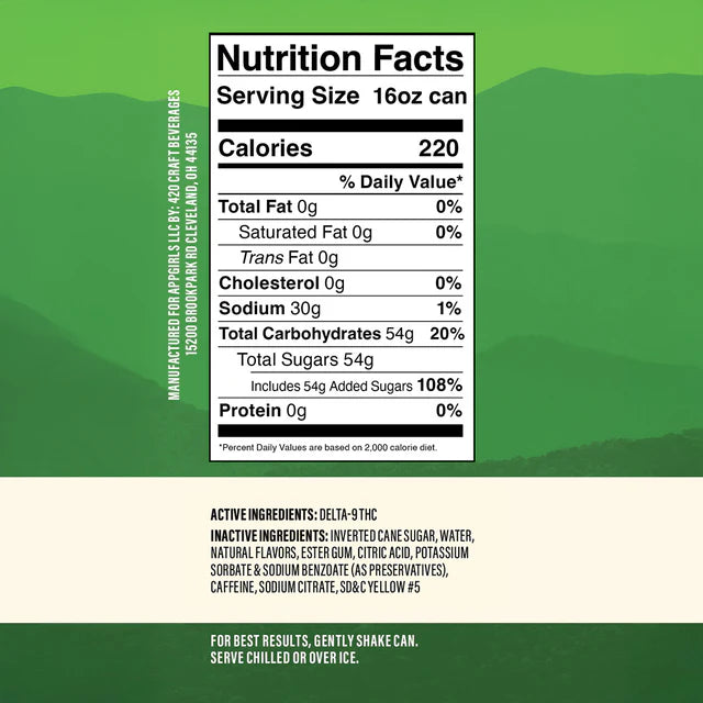 A classic lemon-lime pop with a smooth uplifting buzz: super fizzy, crisp, and refreshing like dew on a ridge-line morning. A kick of caffeine and a precise dose of naturally derived Delta-9 THC deliver an easy, consistent vibe—0% alcohol, no hangover—just pure Appalachian chill.