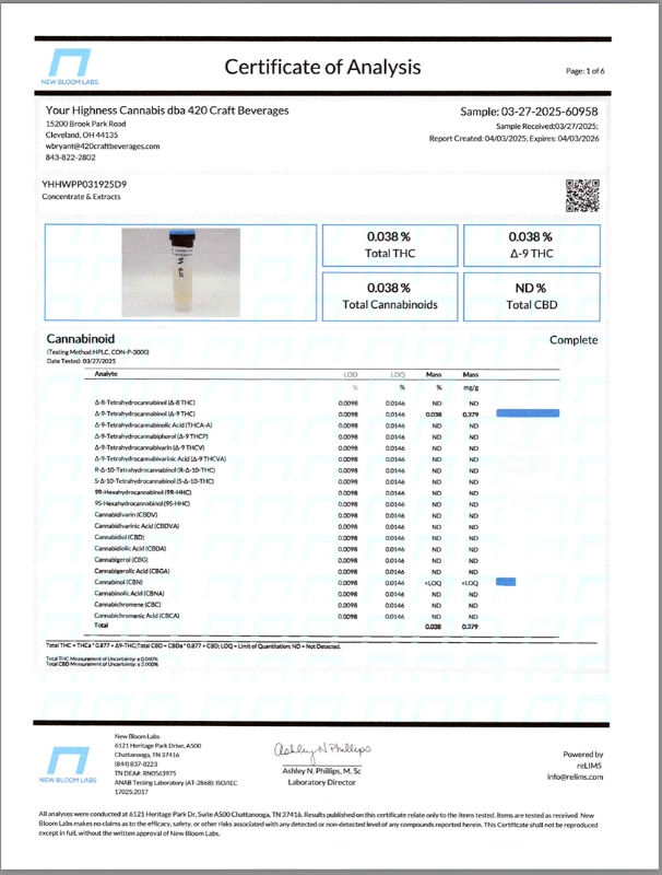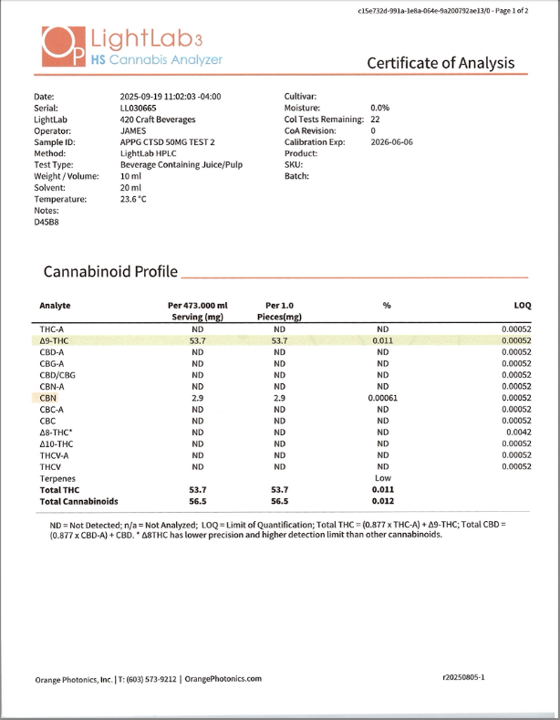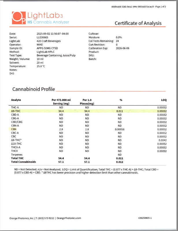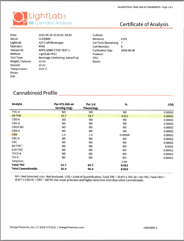 Cannabis can impair concentration, coordination, and judgment. Do not operate a vehicle or machinery under the influence of this product. Warning:This product has intoxicating effects and may be habit forming. Consumers should consult a licensed healthcare professional if pregnant, breast feeding, currently taking medications, or under the age of 21 before consumingcannabis beverage contained herein. Manufactured under License fromThe Ohio Department of Agriculture. 2018 FARM BILL COMPLIANT.