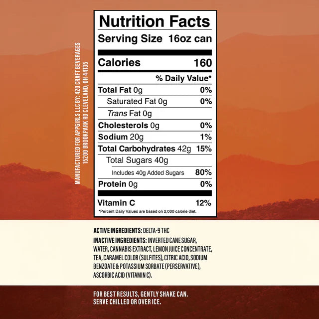 Inverted Cane Sugar, Water, Cannabis Extract, Lemon Juice Concentrate,Tea, Caramel Color (Sulfites), Citric Acid, Sodium Benzoate & Potassium Sorbate (preservative), Ascorbic Acid (Vitamin C).