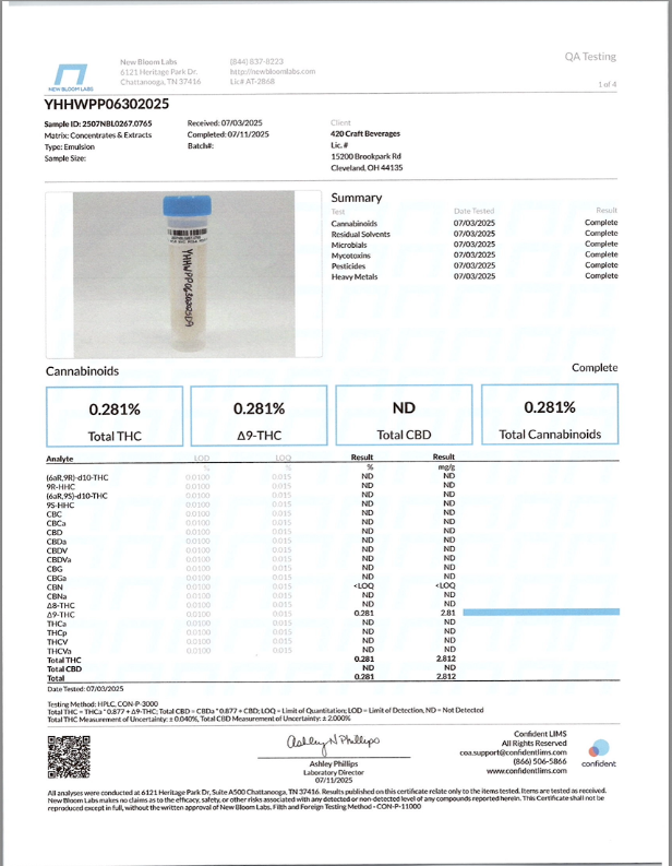 Cannabis can impair concentration, coordination, and judgment. Do not operate a vehicle or machinery under the influence of this product. Warning:This product has intoxicating effects and may be habit forming. Consumers should consult a licensed healthcare professional if pregnant, breast feeding, currently taking medications, or under the age of 21 before consumingcannabis beverage contained herein. Manufactured under License fromThe Ohio Department of Agriculture. 2018 FARM BILL COMPLIANT.