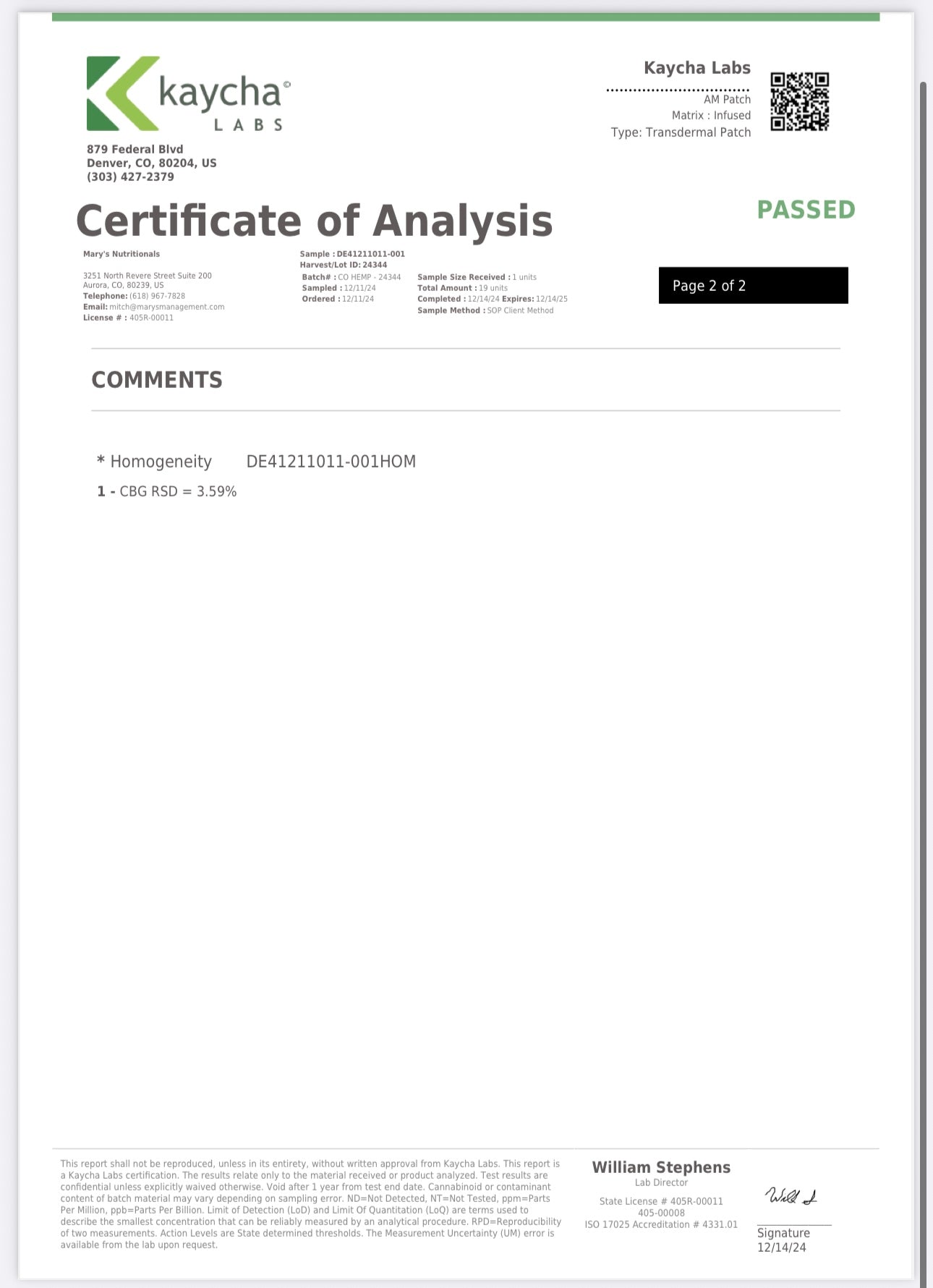 Designed to kick-start your day, Mary’s A.M. Patch combines 10mg of CBD (Cannabidiol) with 10mg of CBG (Cannabigerol) for consistent, balanced release throughout the day. This energizing blend, enhanced with a complementary terpene profile, supports focus, daytime balance, and productivity. Whether you’re tackling a busy workday or staying active, Mary’s A.M. Patch helps you stay energized and focused—powering you through your day with ease.
